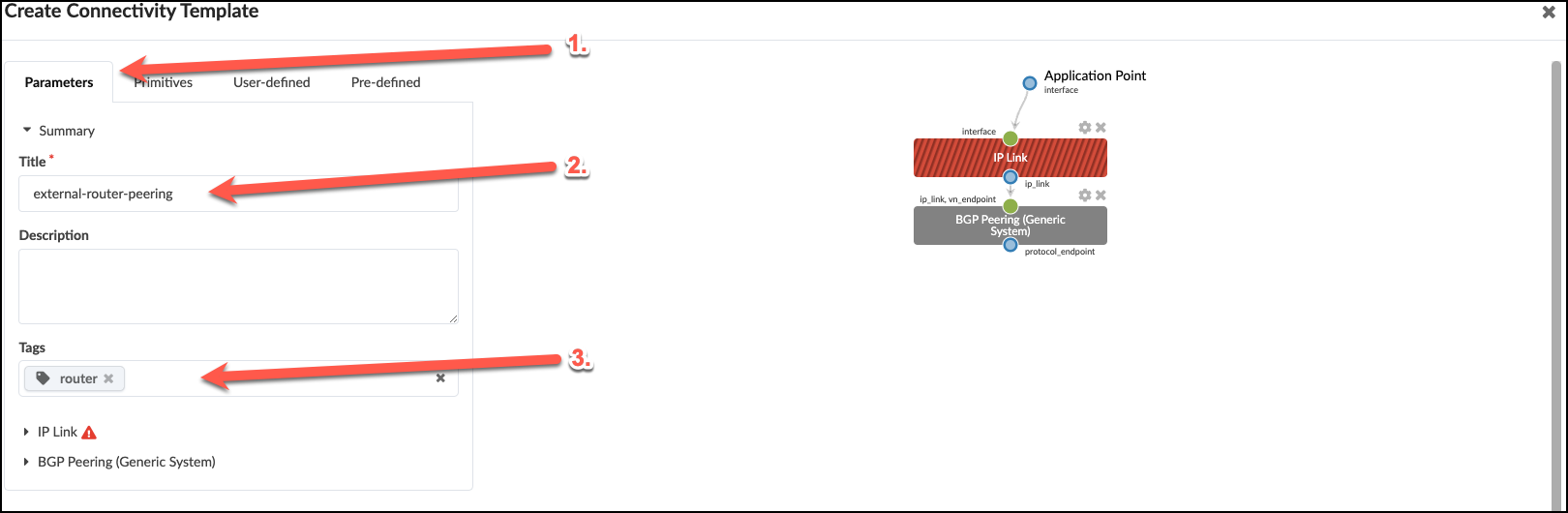 In the dialog that opens, click the Primitives tab then click IP LInk to add the primitive to the template. You will see this object appear in the area to the right of the dialog. Now, click BGP Peering (Generic System) to add it to the IP link primitive in the template. Both objects in the open space to the right. Now, we need to specify parameters for these components.