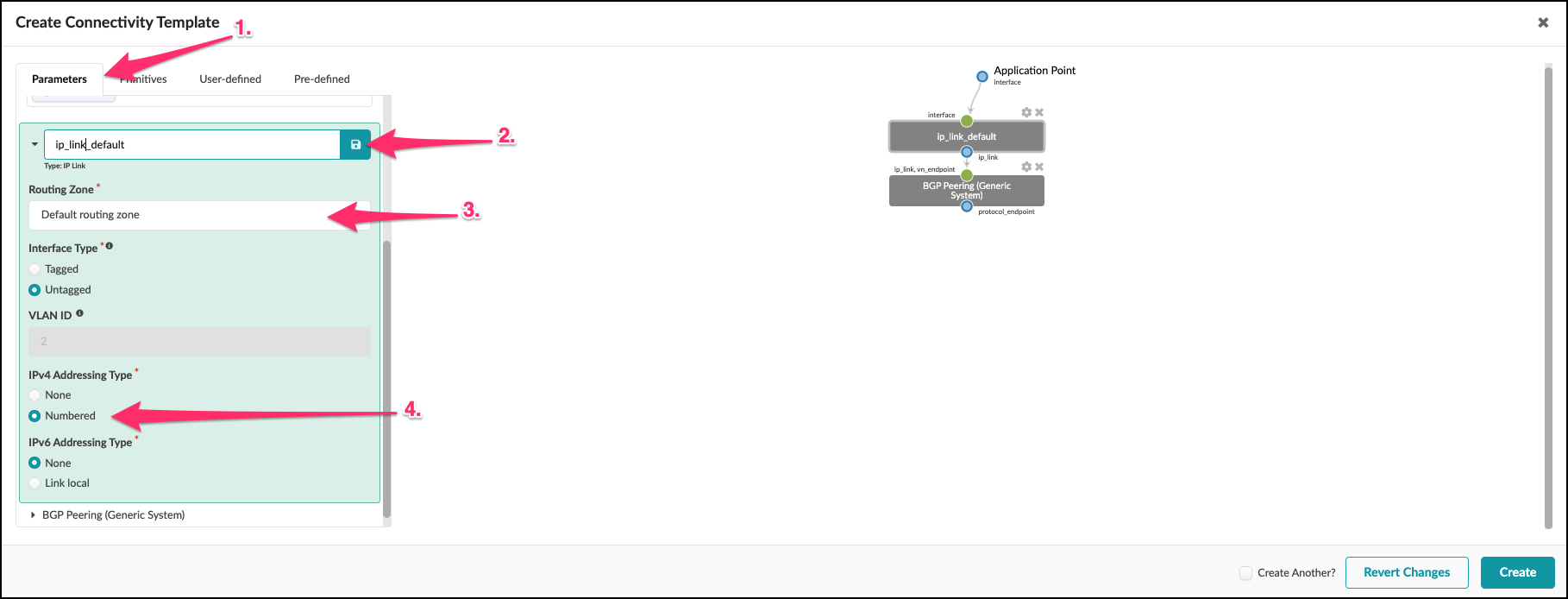 We have given the system details about how we wish to physically connect the leaf pair to the external router. Now we need to tell Apstra what kind of layer 3 characteristics need to be applied to the links. This information is placed into an object known as a Connectivity Template (CT). A CT contains the architectural details necessary for creating an IP Link with BGP peering between the leaf pair and the external router. Let’s begin the process of creating our template.