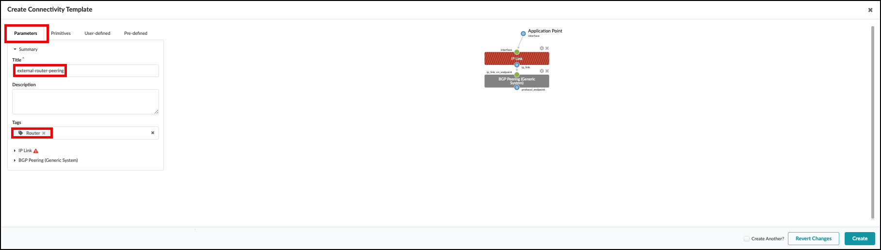When everything looks correct, click Create to finish the creation of the external router link. This process stages the addition of the external router, and it’s link details to the Blueprint. You should see this view when the new router object is created. Click the new external-router and you will be taken to another view.