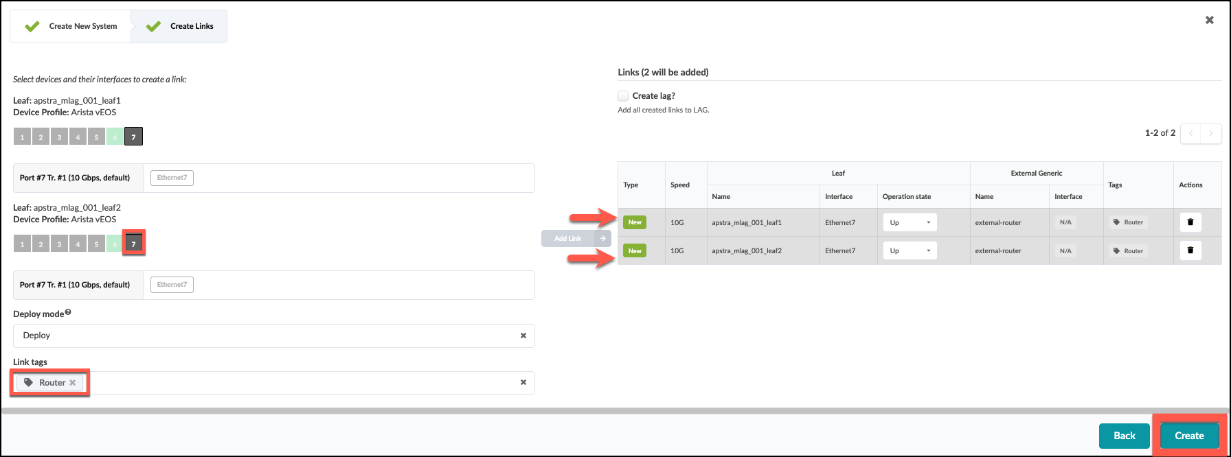 You are presented with a port layout for for each switch in the rack. Click to select the last port available (7) for the first switch and select the 10Gbps transformation. Set Deploy mode to Deploy, then add a tag named "Router" below in the "Link Tags" section.