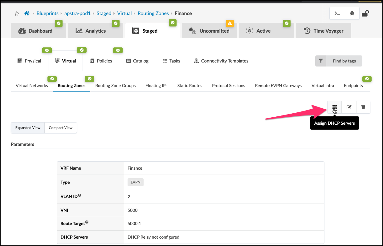 Select the new Finance RZ in the VRF Name column. In the Finance routing zone detail page, click the Assign DHCP Servers button.