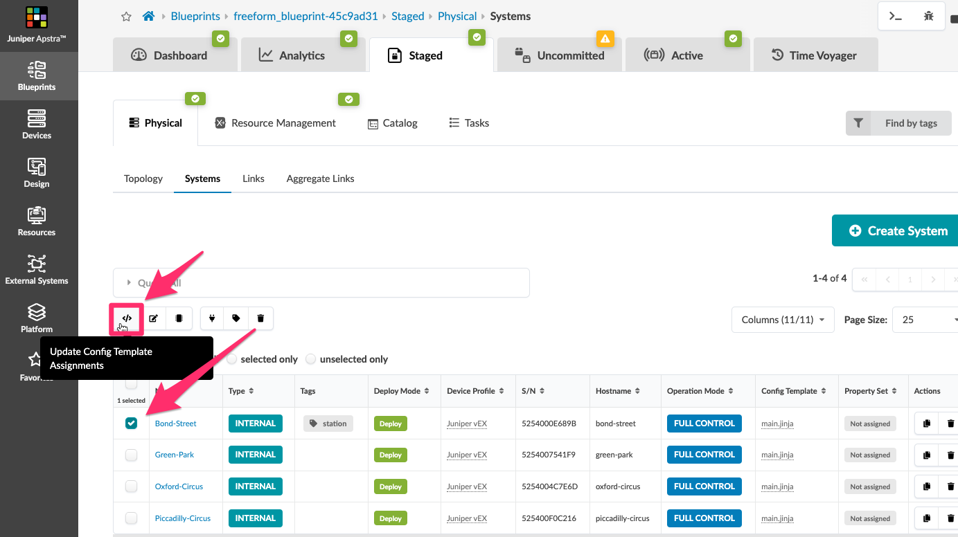 Viewing the currently assigned Config Template is possible in more than one manner. The table located at Staged > Physical > Systems shows various details about the Blueprint’s devices. This includes what templates are assigned to each device.